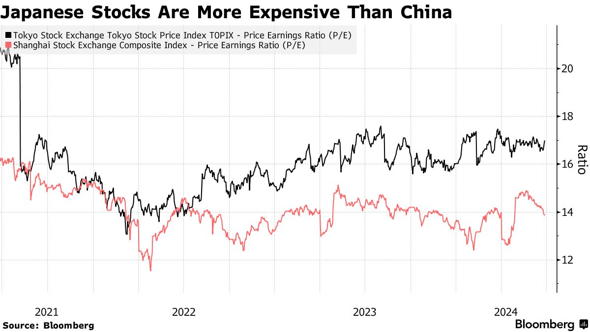 货币风险和经济放缓导致一些外国投资者将目光投向日本以外的市场。TOPIX指数的市盈率约为17倍,而上海证券交易所综合指数的市盈率为14倍。外国投资者连续五周抛售日本现金股票,这是自去年三月以来最长的抛售潮。