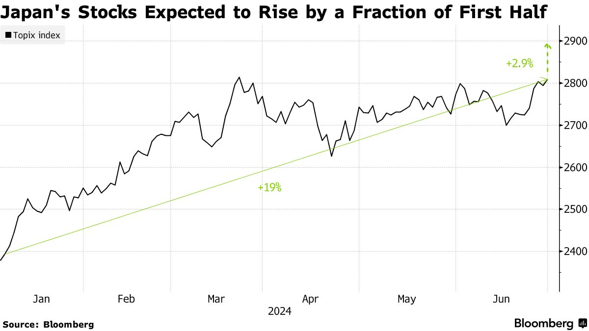根据彭博社对资产管理人和策略师的平均估计,标准Topix指数将在年底前上涨约2.9%至2,890点,而日经225股票平均指数将上涨约4.8%至41,489点。这只是前六个月这些指数大约18%的涨幅的一小部分。更广泛的Topix指数在周五盘中超过了三十四年来的最高点,主要受到金融股的带动。