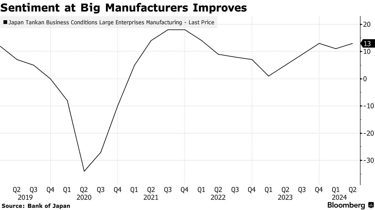 根据日本央行周一发布的季度短观报告,该国最大制造商的信心指数从3月的11上升到6月的13。经济学家预测这一指数将保持不变。