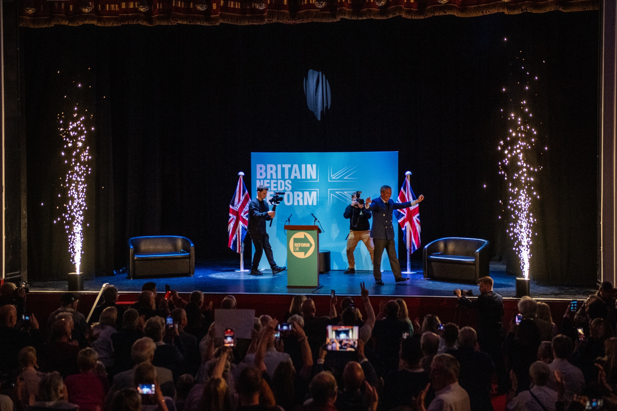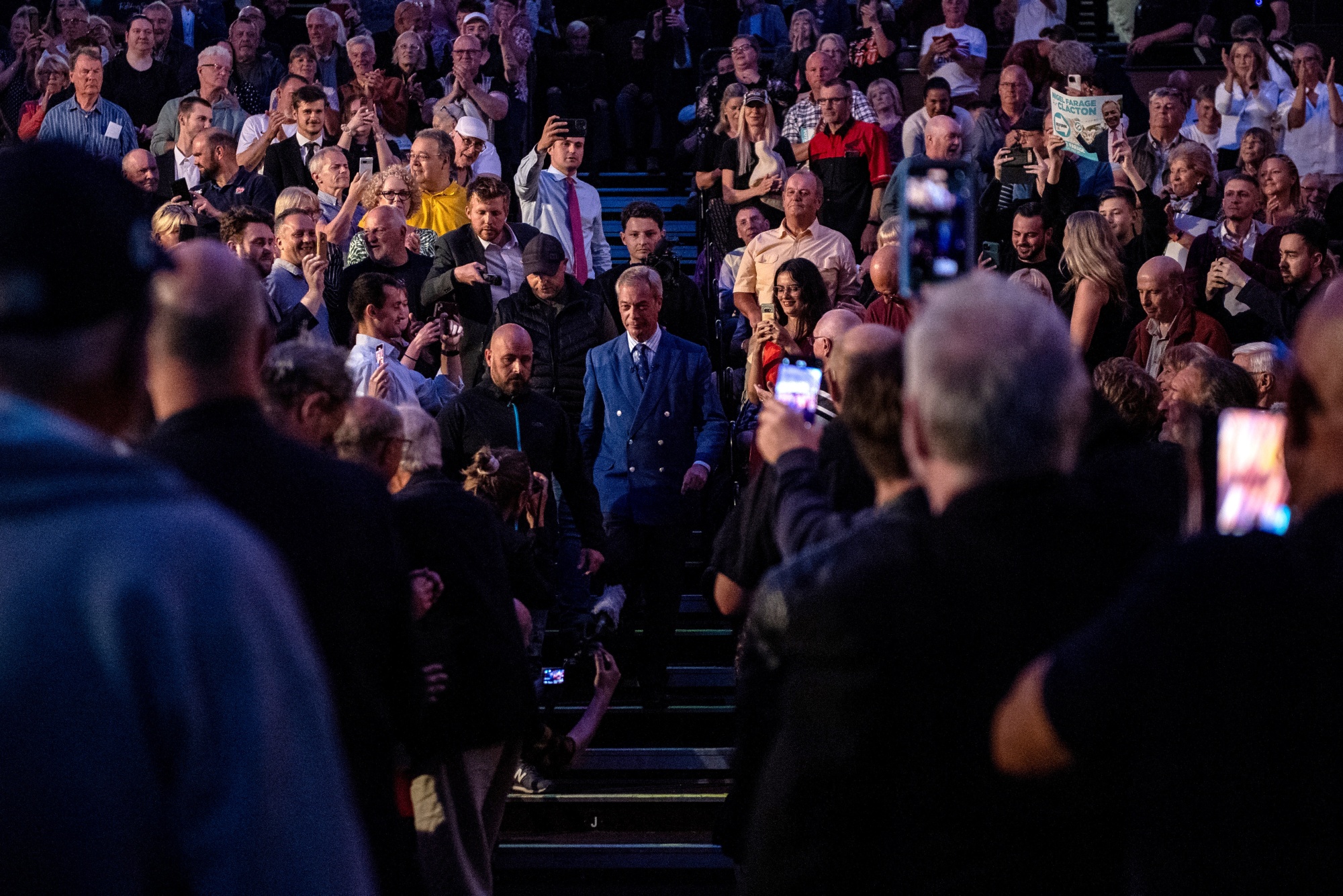 克拉克顿的王子剧院的观众为法拉奇鼓掌。摄影师:克里斯·J·拉特克利夫/彭博社但即使下一任保守党领袖将法拉奇排除在外,下一次选举周期中这个问题也不会消失。一位资深保守党助手表示,在面对工党可能连续第二次大胜的压力下,与改革党达成协议的压力将会增加。