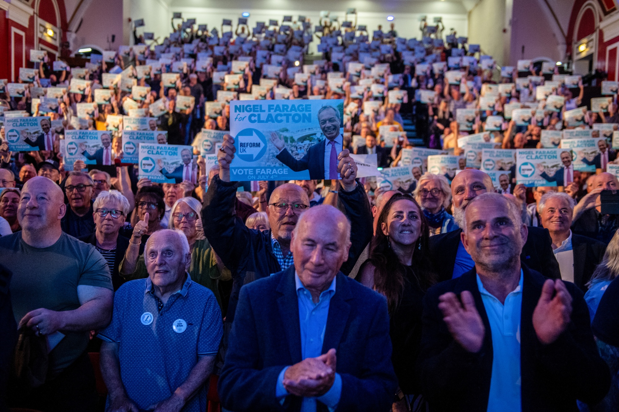 改革英国领袖奈杰尔·法拉奇(Nigel Farage)在6月18日的克拉克顿(Clacton)大选竞选活动中走向舞台。