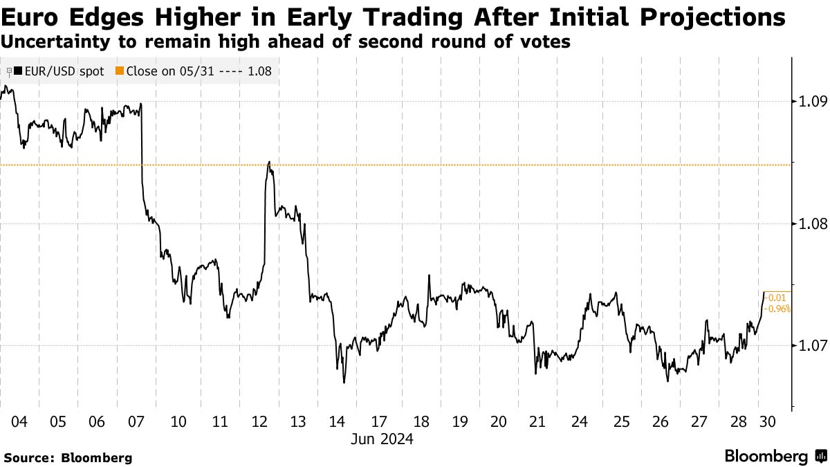 法国立法选举的第一轮裁决在某种程度上是清晰的。极右翼和极左翼击败了总统埃马纽埃尔·马克龙的党派,将其排到第三位,初步预测显示国民集会有机会在下周日的第二轮选举后获得绝对多数席位(尽管每个党派可能获得的席位范围很广)。这对投资者来说听起来不太好。然而,由玛琳·勒庞领导的集会似乎比预期稍微糟糕,存在僵局的可能性,或者与马克龙及其左翼力量结盟对抗她。这些选项都不吸引人,政治不确定性仍然存在。但最糟糕的恐惧尚未——至少目前——成真,因此欧元实际上在亚洲交易中略微上涨。
