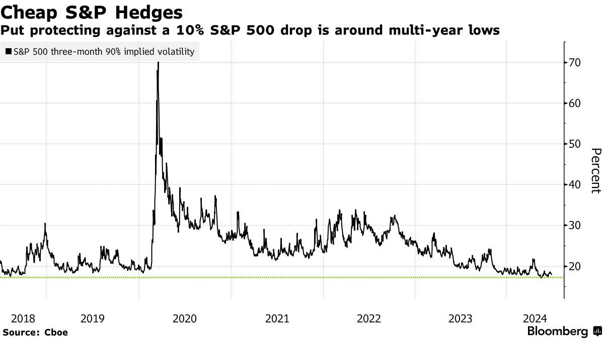 目前,用于保护免受突然下跌的广泛市场对冲仍然便宜。根据彭博社编制的数据,保护免受标普500指数下跌10%的三个月看跌期权价格接近多年低点。