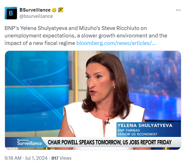接下来将是一个重要的经济数据周,从职位空缺到6月非农就业报告。BNP的Yelena Shulyatyeva表示,她认为失业率可能比创造的就业岗位总数更重要。