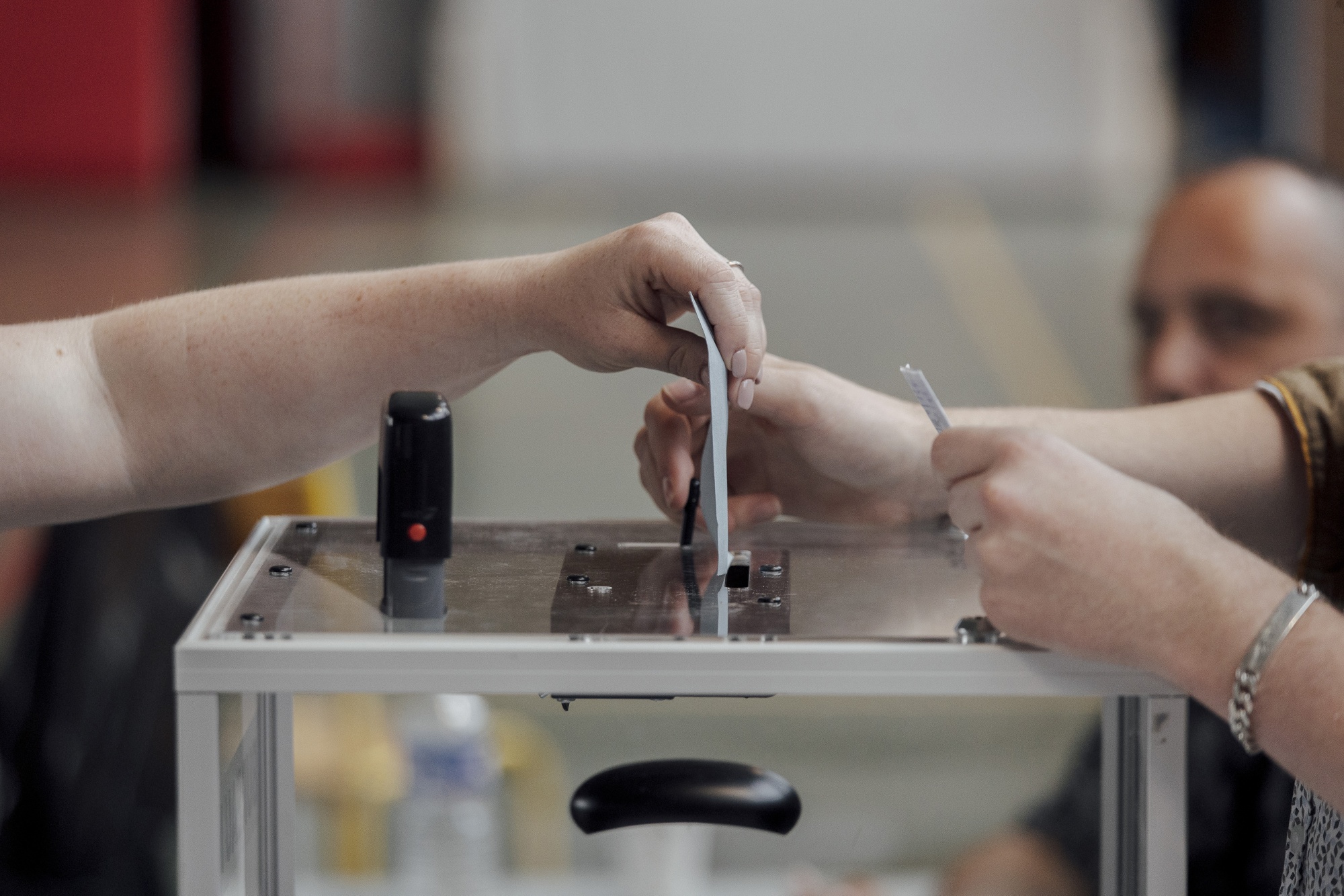 一名选民在法国亨尼-博蒙特的一个投票站将他们的选票放入投票箱。