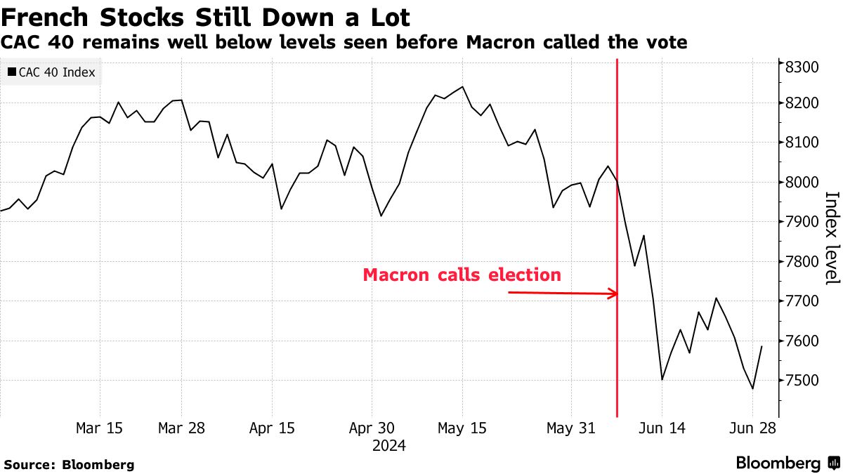 - 股票:这可能会延长围绕法国和欧洲股市的不确定性,至少暂时,因为投资者可能会选择观望,看看政府将采取什么政策。法国股票可能会重新测试上周的低点,市场可能表现不佳。另外,狭窄的财政空间可能会迫使政府采取负责任的行动;意大利等极右翼政府的先前经验已被证明比预期更有利于市场。