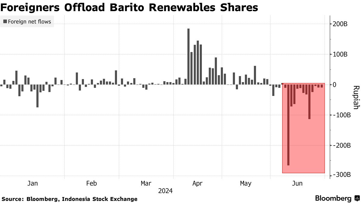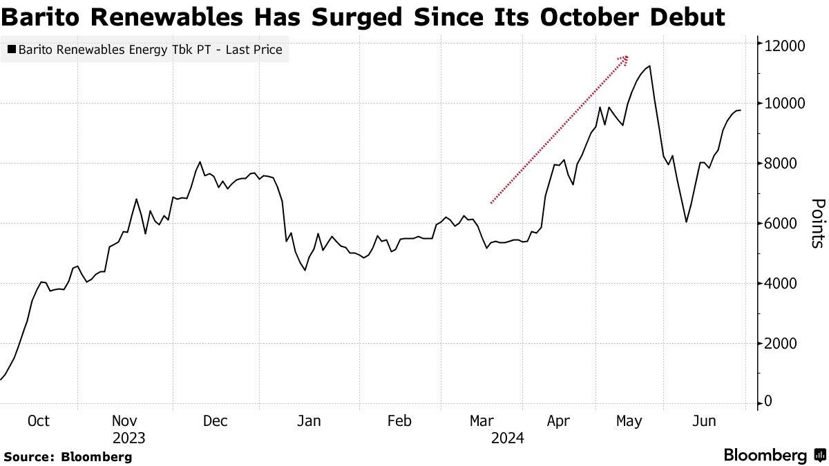 最初,这些限制并未引起太多关注。直到印度尼西亚证券交易所在五月底将Barito Renewables列入名单,而没有提供任何具体原因,只是简单地提到股价“显著增长”。