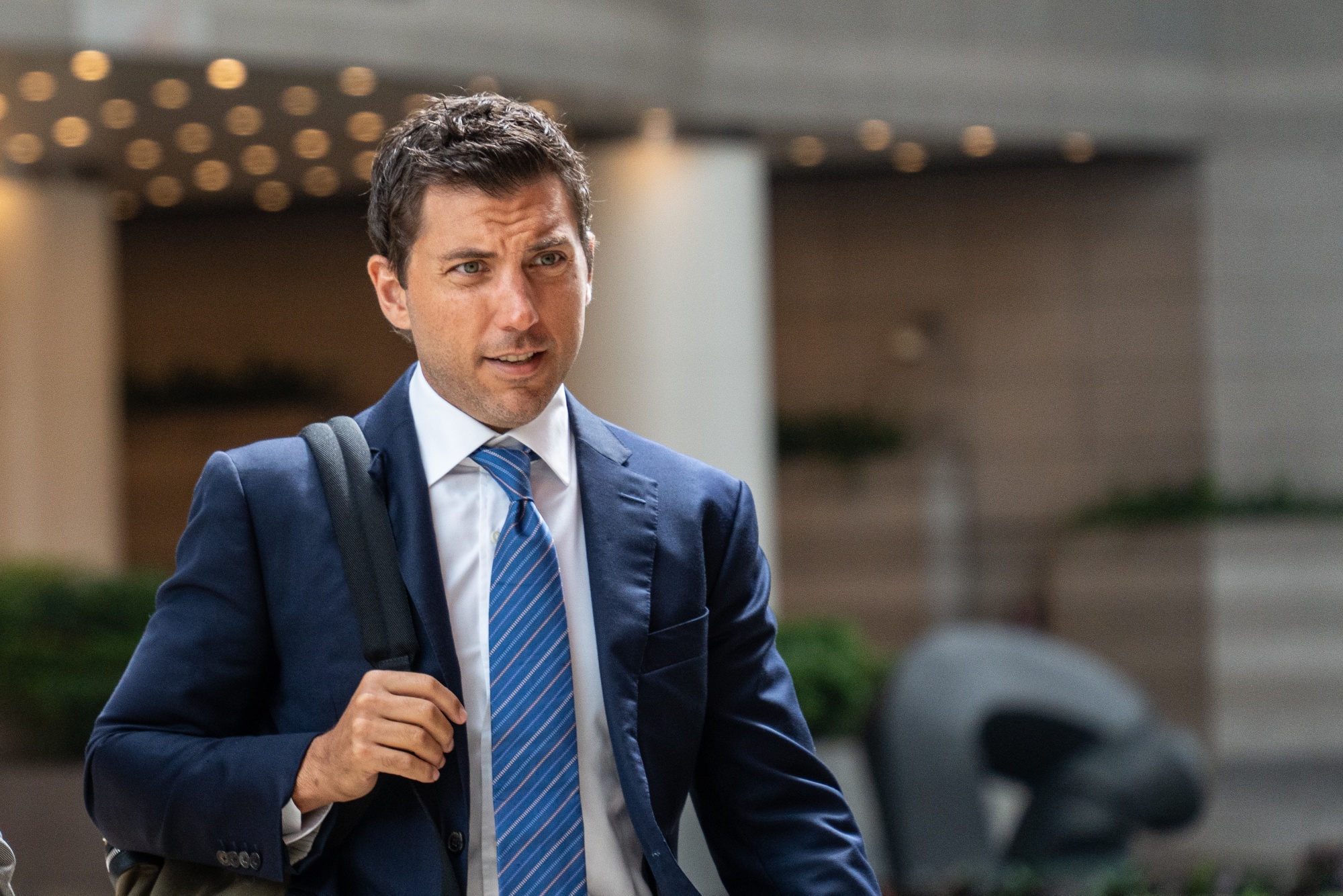 Simon Sadler 于7月2日。摄影师:陈朗熙/彭博社Sadler与Segantii首席合规官Niral Maru、律师Derek Chan等人乘坐两辆专车抵达。La Rocca和他的律师Alan Linning则乘坐另一辆出租车到达。听证会定于香港时间上午10:15开始,还有约十几个其他案件。