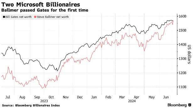 **微软亿万富翁。**前CEO史蒂夫·鲍尔默超越比尔·盖茨,成为世界第六富有的人,这是他首次比公司联合创始人更富有。鲍尔默的财富现在达到1572亿美元。