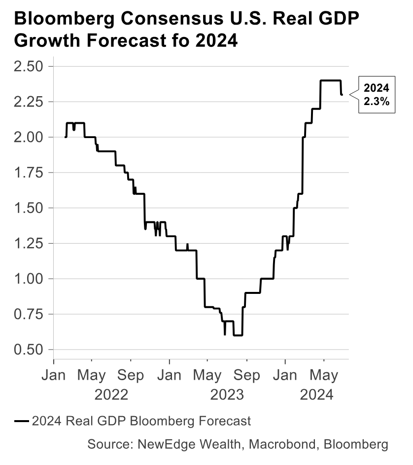 与此同时,卡梅伦·道森在NewEdge昨天在一个图表中指出,我们最近看到了2024年美国GDP预估的小幅下调。虽然单独看来,这种小幅下调可能并不是什么大问题,但令人惊讶的是,自去年中以来,这一数据曾几乎一直是一个近乎笔直的上升曲线。