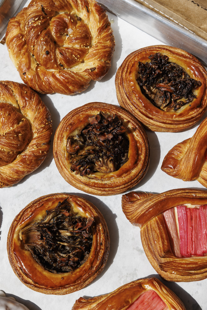 从左上角开始:Radio Bakery的葱芝麻扭结面包、烤蘑菇羊角面包和大黄卡仕达面包。来源:Alex Stein### Radio Bakery,Greenpoint