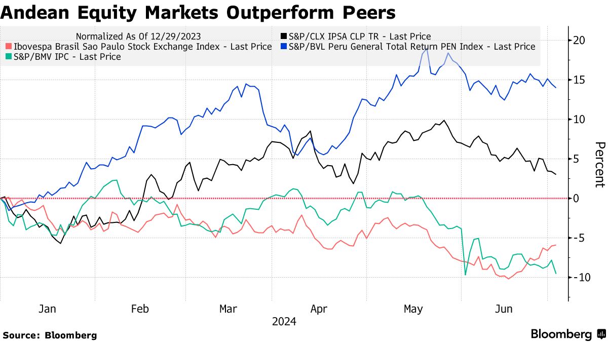 分析师阿隆索·阿兰布鲁在给客户的一份备忘录中表示,改善的政治环境、较高的大宗商品价格以及安第斯国家的货币宽松周期将共同推动盈利增长,并在2024年下半年和2025年推高股票价格。