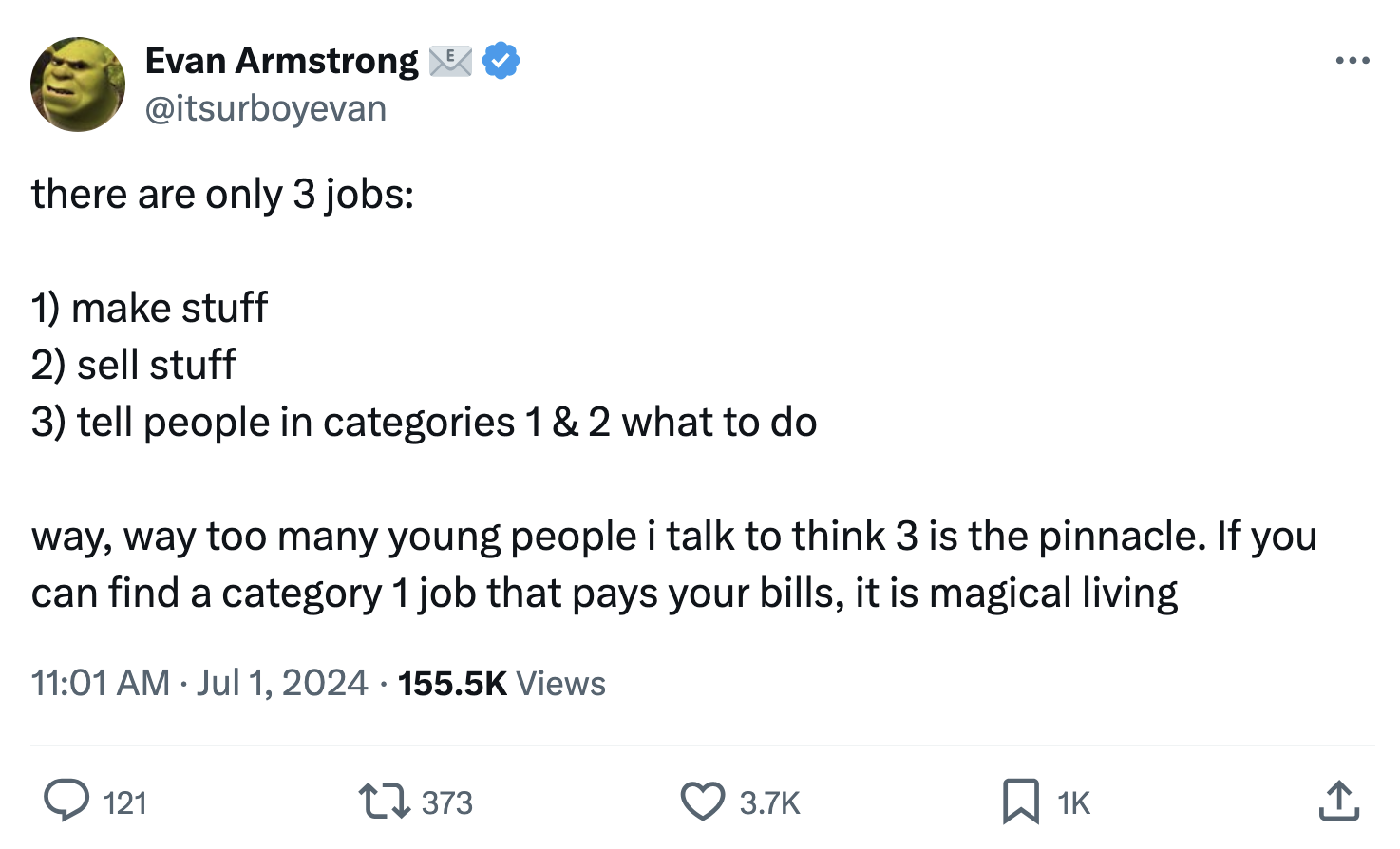 显然,有些运气是有关的。但基本原则——冒险!——是关键。刚刚毕业的人需要暂时放下“梦想工作”的概念。问问自己:你认识多少活生生的哲学家?零,没有,一个都没有:“哲学专业的人很少最终成为哲学家,即使商科和工程专业的人最终也会进入各种各样的职业和城市,”乔纳森指出。如果更多的Z世代能够接受非传统的职业道路——不一定要像搬到玻利维亚那么戏剧性!——我们将拥有一个更具弹性的劳动力市场。这条来自作家Evan Armstrong的推文也表达了同样的观点: