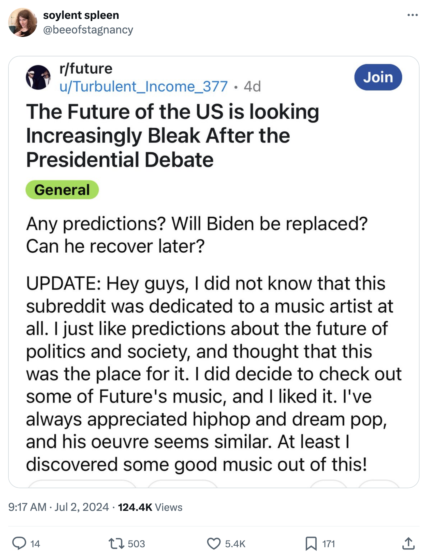 至于Reddit用户的倒数第二个问题 — 拜登会被换掉吗? — 目前还没有答案。“大多数人已经意识到没有现成的解决方案,”弗朗西斯·威尔金森写道。仅今天,前俄亥俄州民主党国会议员蒂姆·瑞安表示卡玛拉·哈里斯应该取代她的老板(他可能有所发现),得克萨斯州国会议员劳埃德·多格特呼吁拜登退出 — 这是国会中第一个这样做的民主党人 — 玛丽安娜·威廉姆森则加入了竞选(再次)。弗朗西斯表示:“比赛的动态一开始对拜登并不利,现在更加倾向于他。”