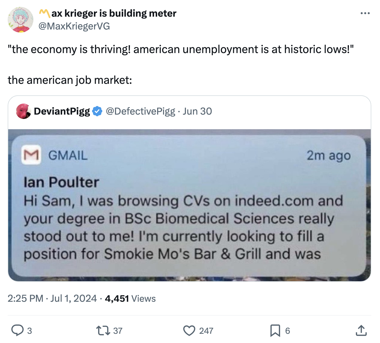 考虑一下新员工与总员工的比例。这一比例接近十年来的最低点。求职申请的反馈率?糟糕透顶。而且通过名为“Mia with Indeed”的机器人欺骗了超过10万人,仅在过去一年中就有工作欺诈。即使工作岗位是真实的,Parmy Olson表示年轻人正在与“虾耶稣”的创作者竞争,这是一个涂满甲壳动物的基督的AI渲染。