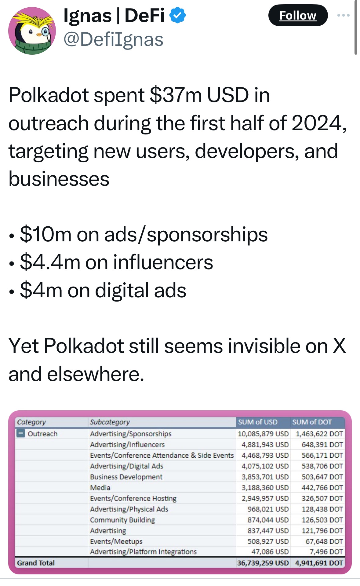 波卡点是如何走到这一步的?让我们深入分析一下:在2024年上半年,波卡点支出最大的增长是在名为“外联”的类别中,支出近3700万美元。这比2023年下半年在外联上支出的770万美元增加了300%以上。(波卡点没有回复评论请求。)