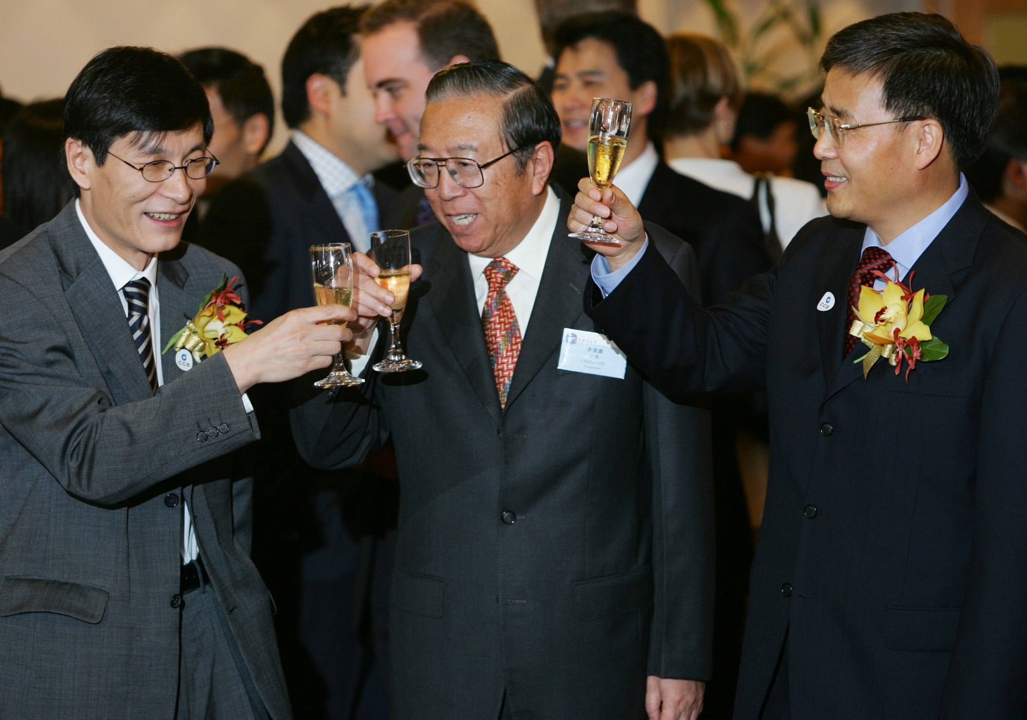 左起:中国国际金融公司CEO朱镕基、香港交易及结算所主席李小加和中国建设银行董事长郭树清,2005年在香港证券交易所举行建行IPO时的照片。摄影师:Bobby Yip/路透社陈和部门负责人通常在会议开始时背诵习的口号,中国称之为“习近平思想”。接着是最近国务院和中央政治局会议的要点。