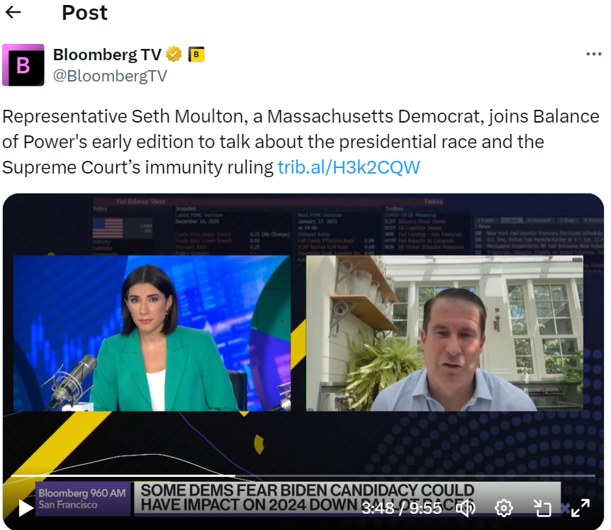 今天在彭博电视台的权力平衡早间版节目中,主持人乔·马修和凯利·莱因兹采访了马萨诸塞州民主党代表塞思·莫尔顿,谈及总统竞选和最高法院的豁免裁决。