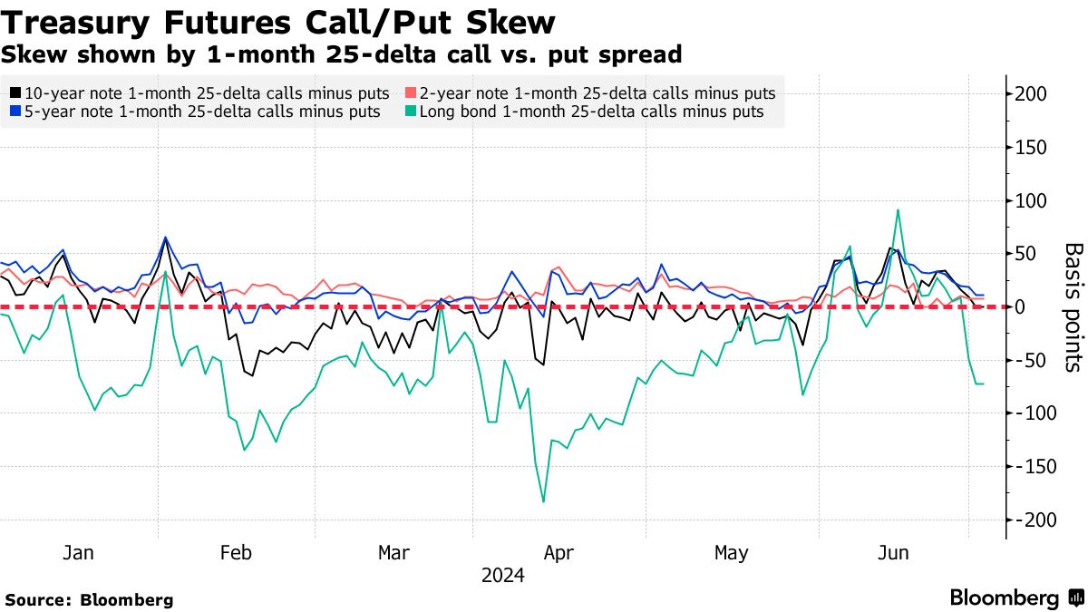 在期权市场,交易员为对冲债券期货合约的抛售风险支付了一个月来最昂贵的保费。