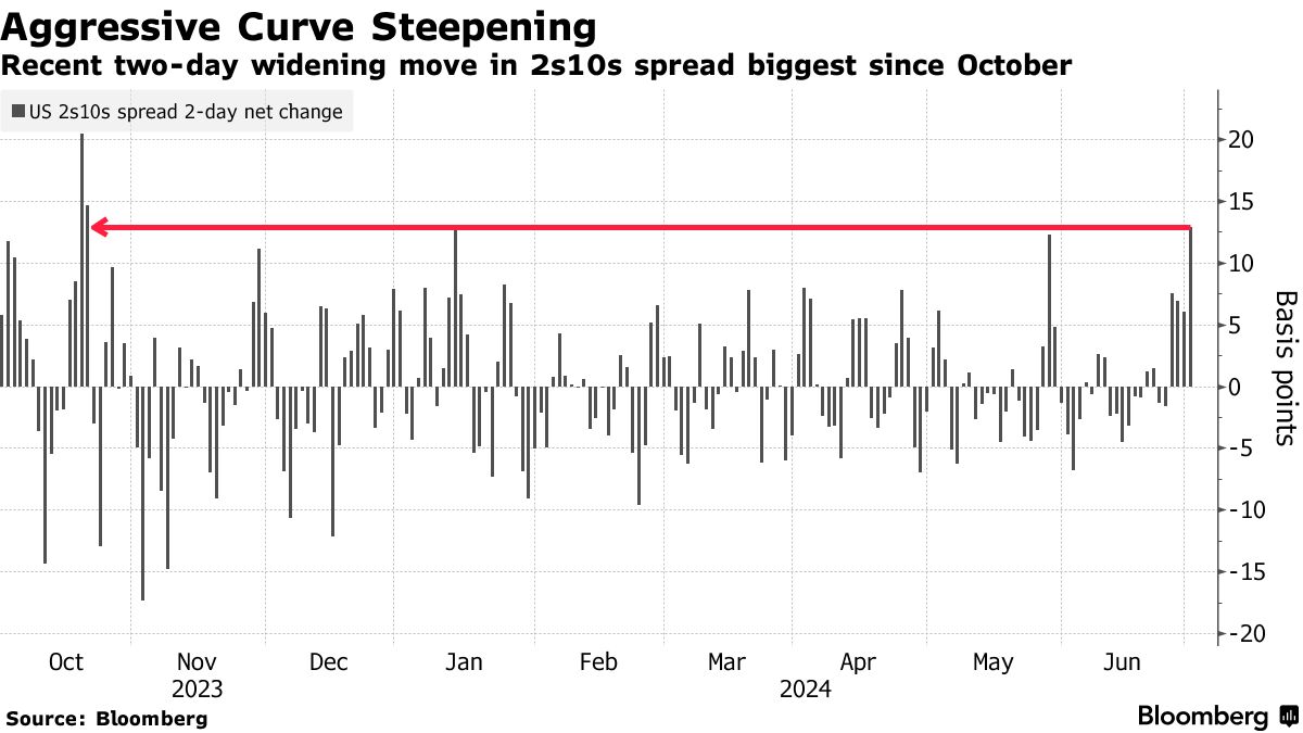 在周五和周一,持有交易员的风险数量急剧上升,因为两年期和十年期收益率之间的差距扩大。这导致曲线陡化了大约13个基点,是自10月以来最大的两天内的变动。