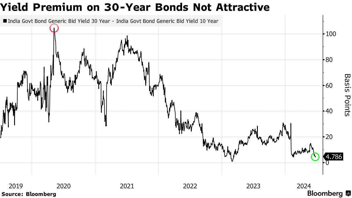 30年期基准主权债券的溢价最近从2020年的100个基点缩小到约五个基点。这是自2023年3月以来最窄的。