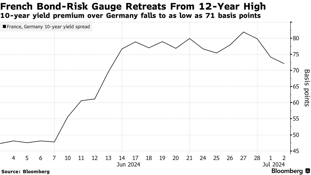 “在过去几天里,市场似乎在庆祝法国可能出现悬而未决的议会的可能性,”荷兰合作银行外汇策略负责人简·福利在彭博电视台上说。“悬而未决的议会意味着法国将无法在进一步降低其预算赤字方面取得实质性进展 — 这意味着法国可能会在与布鲁塞尔的进一步困难中。”
