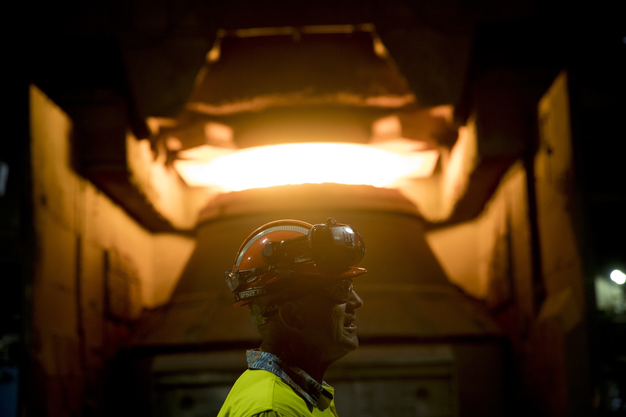 一名员工站在澳大利亚BlueScope Steel Ltd. Port Kembla钢铁厂的钢炉前。