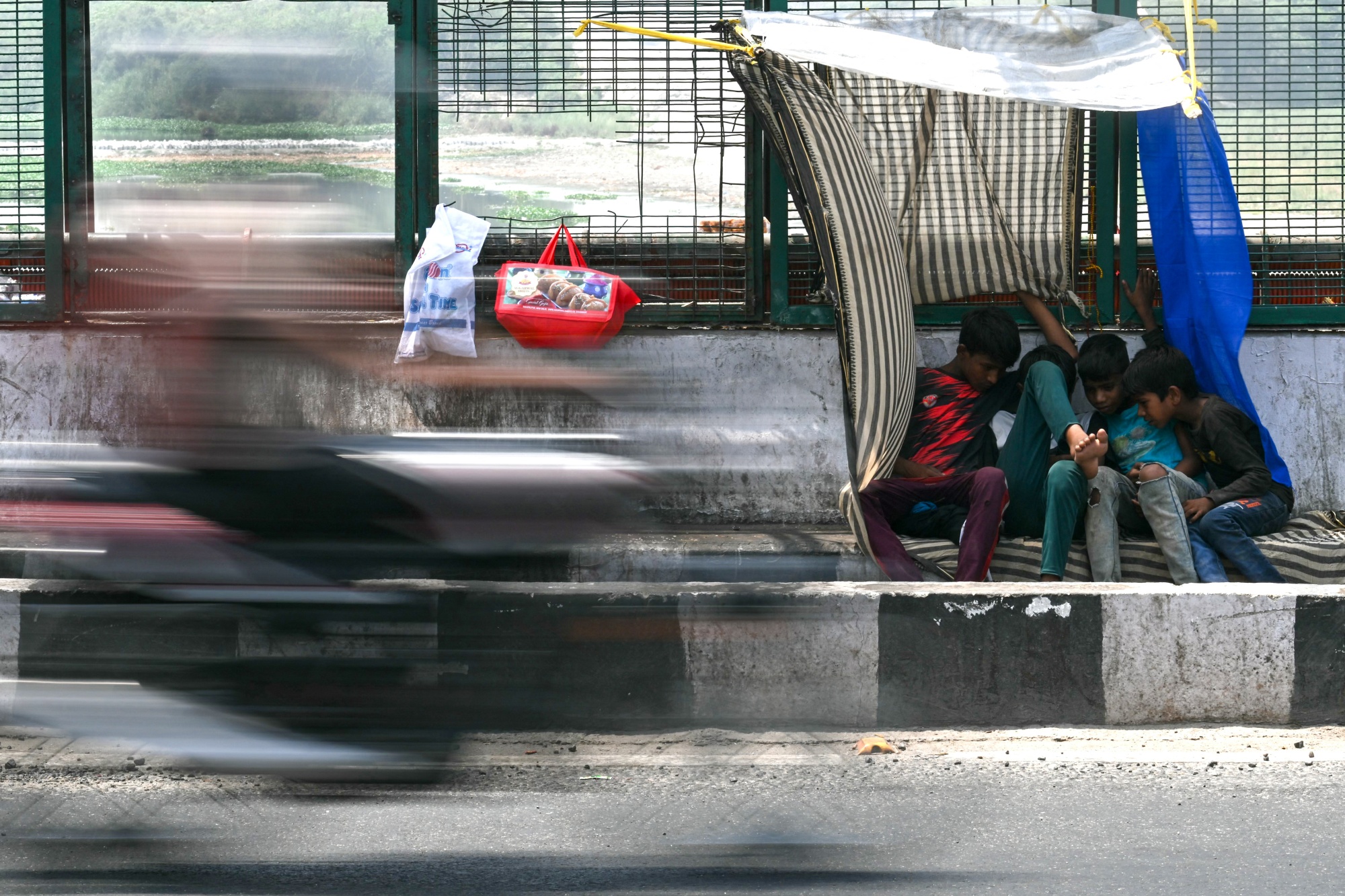 男孩们在5月28日的新德里临时遮篷下坐着。摄影师:Arun Sankar/AFP/Getty Images### 更多来自彭博社