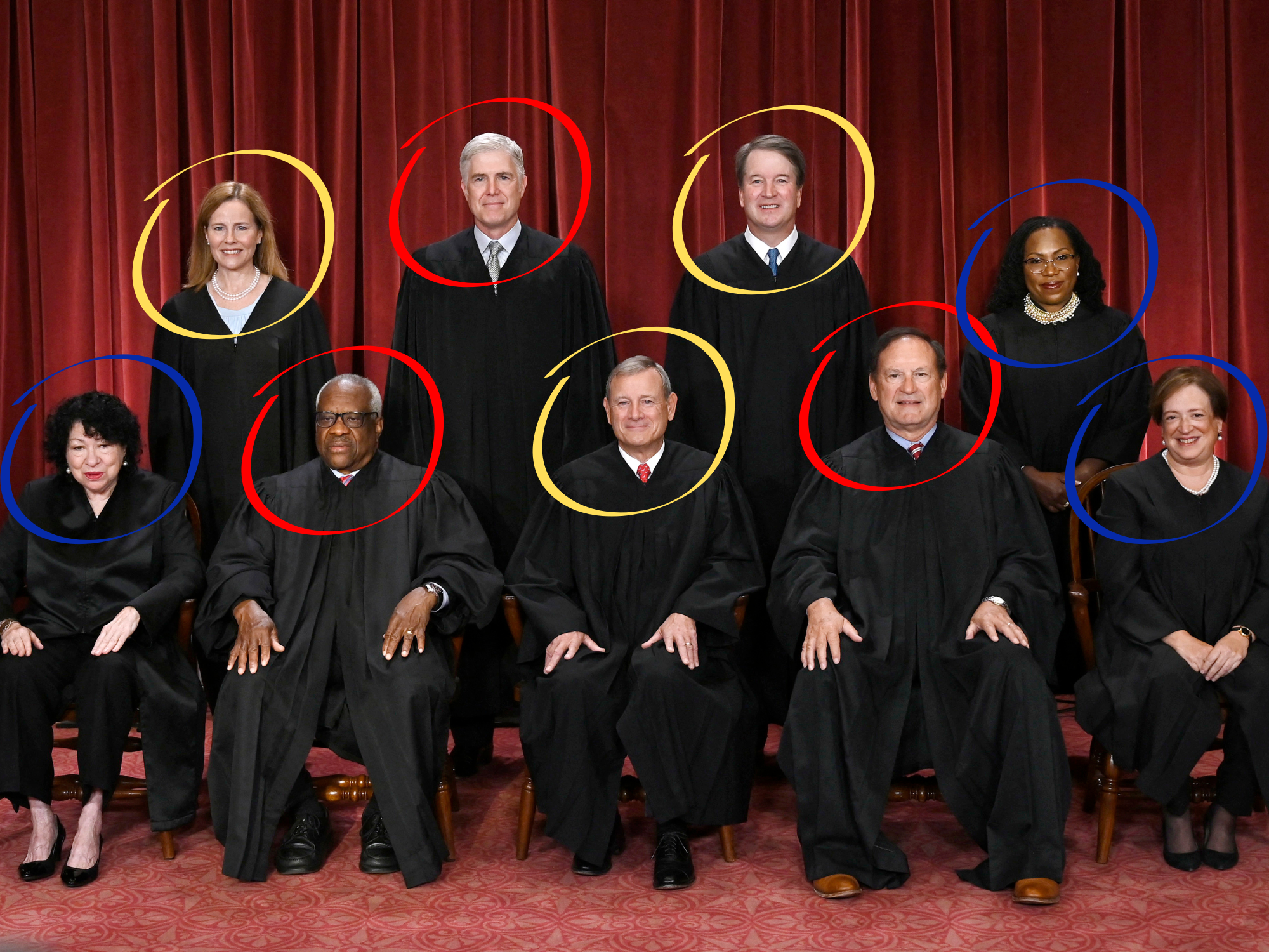 我们已经知道最高法院的三名自由派大法官,包括埃琳娜·卡根、索尼娅·索托马约和凯坦吉·布朗·杰克逊。新的是最高法院保守派之间的明显分裂:包括克拉伦斯·托马斯、塞缪尔·阿利托和尼尔·戈萨奇在内的极端保守派大法官组成一派,而由首席大法官约翰·罗伯茨以及大法官艾米·科尼·巴雷特和布雷特·卡瓦诺组成的中间保守派一派。