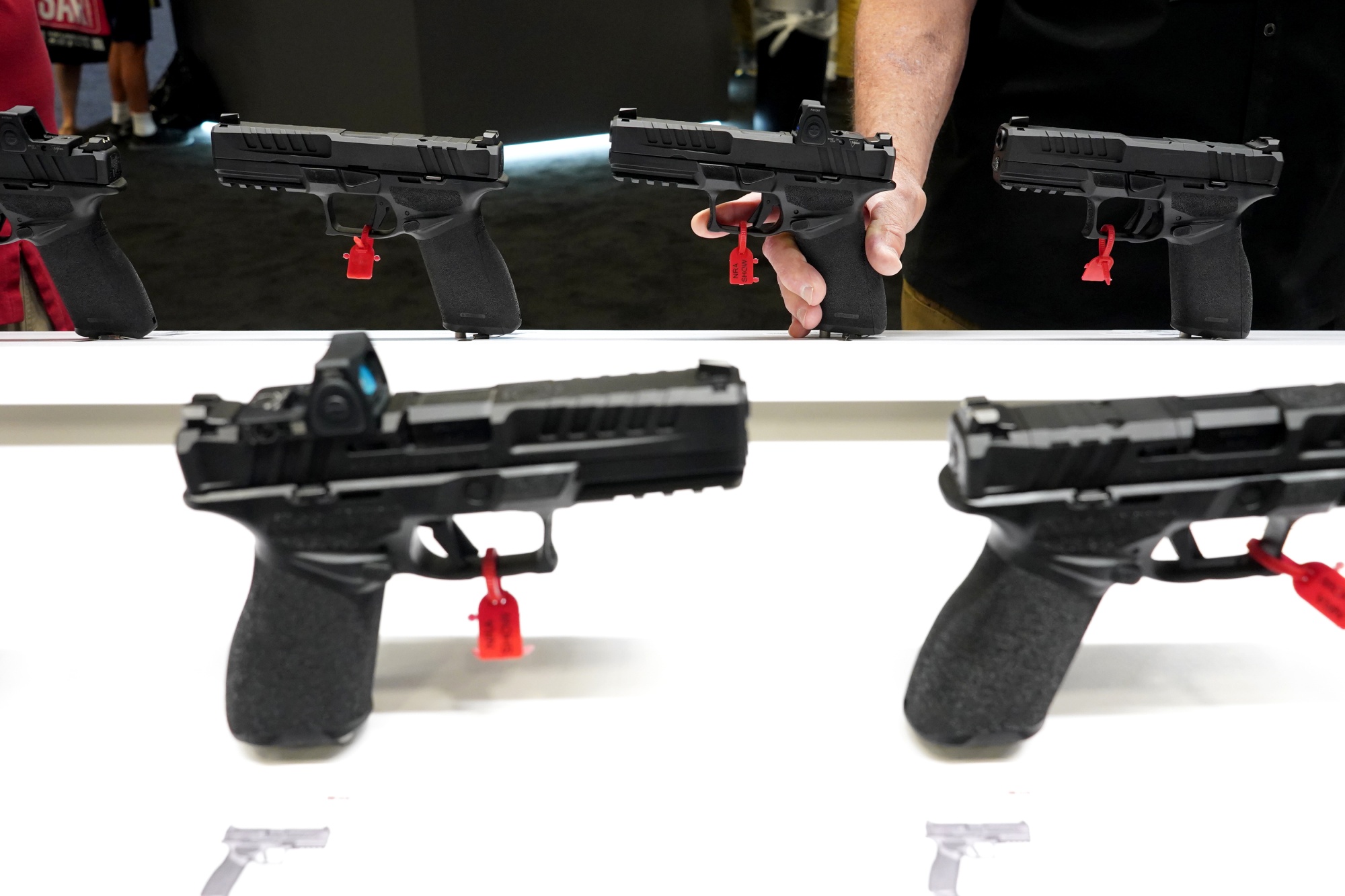 在全国步枪协会年度大会上的手枪。摄影师:Nathan Howard/Bloomberg对枪支权利的挫折同样狭窄,法院维持了对家庭暴力令下的人员禁止拥有枪支的联邦禁令。这项8-1的裁决表示,政府长期以来一直在剥夺危险人员的武装,但没有批准其他联邦限制措施,包括适用于已被定罪的重罪犯的禁令。