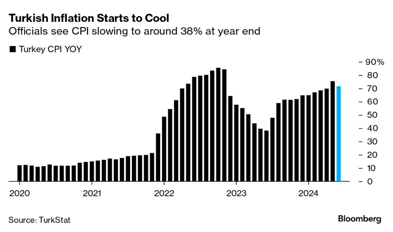土耳其通胀率首次放缓 8个月来首次。6月,总体消费者价格增长放缓至71.6%,这是没有任何一位接受彭博调查的经济学家预测到的急剧减速。