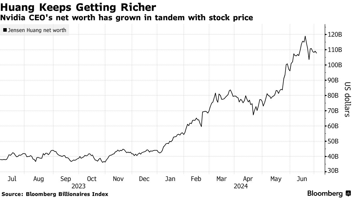 这次抛售了130万股,是他今年的第一次,而这发生在Nvidia的市值首次超过3万亿美元的一个月。这使其短暂成为全球市值最高的公司,并将61岁的黄仁勋推到了拥有超过1000亿美元财富的超级富豪群体中。