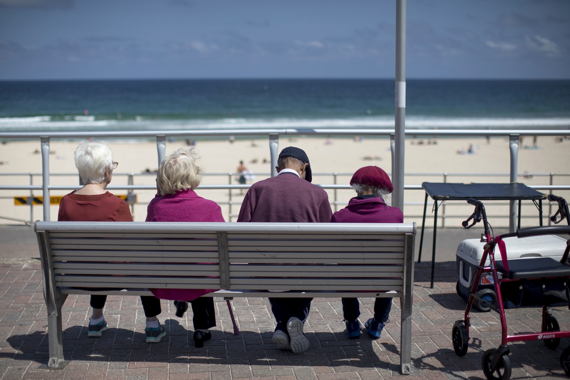 人们坐在悉尼澳大利亚的邦迪海滩的长椅上。