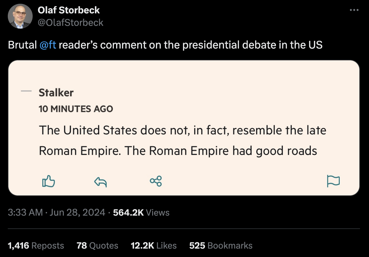 虽然囤积芦笋不再是犯罪行为,但有很多事情仍然没有改变。现在是2024年,我们仍在辩论财富税。我们仍在支付公共娱乐费用(即花20美元观看佩德罗·帕斯卡穿着皮裙)。我们仍在思考如何应对经济挑战,比如快速通货膨胀。我们的解决方案可能不像罗马那样残酷,但货币政策的基本框架都在那里。现在,如果我们能把基础设施搞好: