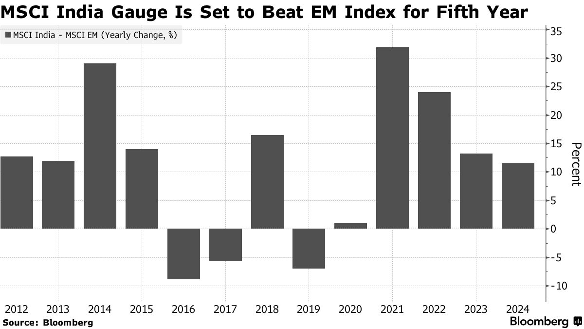 彭博智库编制的数据显示,分析师预计2024年整个日历年度印度MSCI指数公司的每股盈利将同比增长15.6%。相比之下,预计中国公司在同一时期的每股盈利将增长10%。