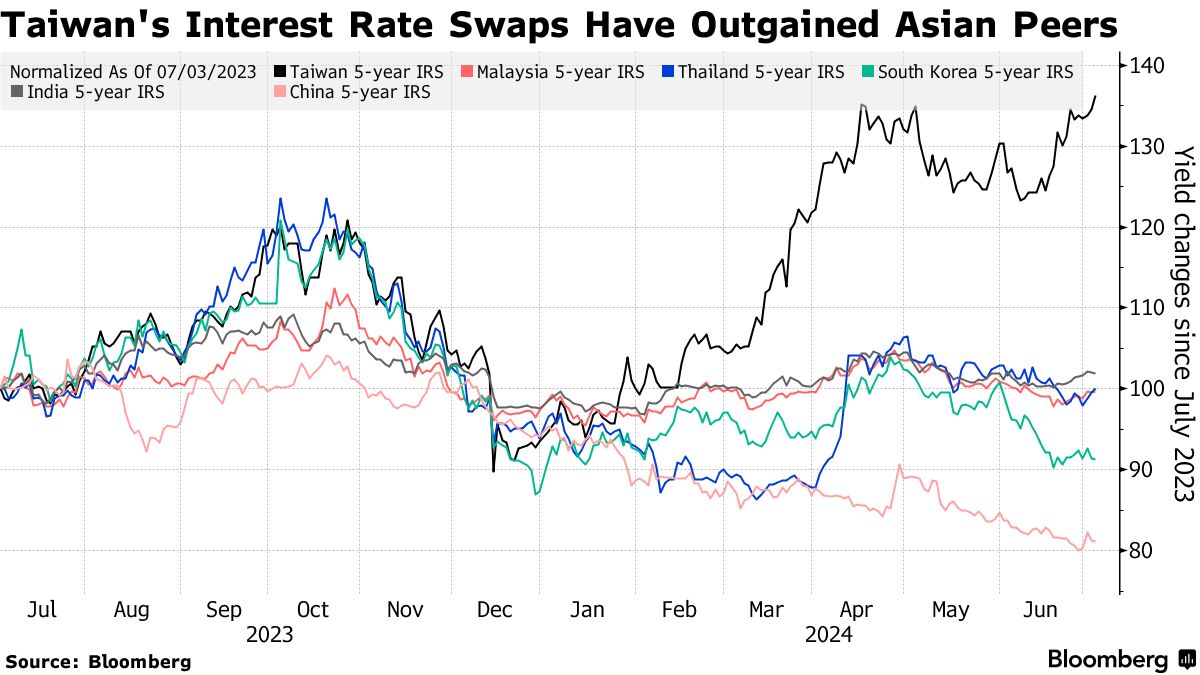 “在亚洲各国中,台湾的利率互换市场今年肯定是最引人注目的,”Chiu表示,因为大多数其他国家正在走向宽松货币政策。