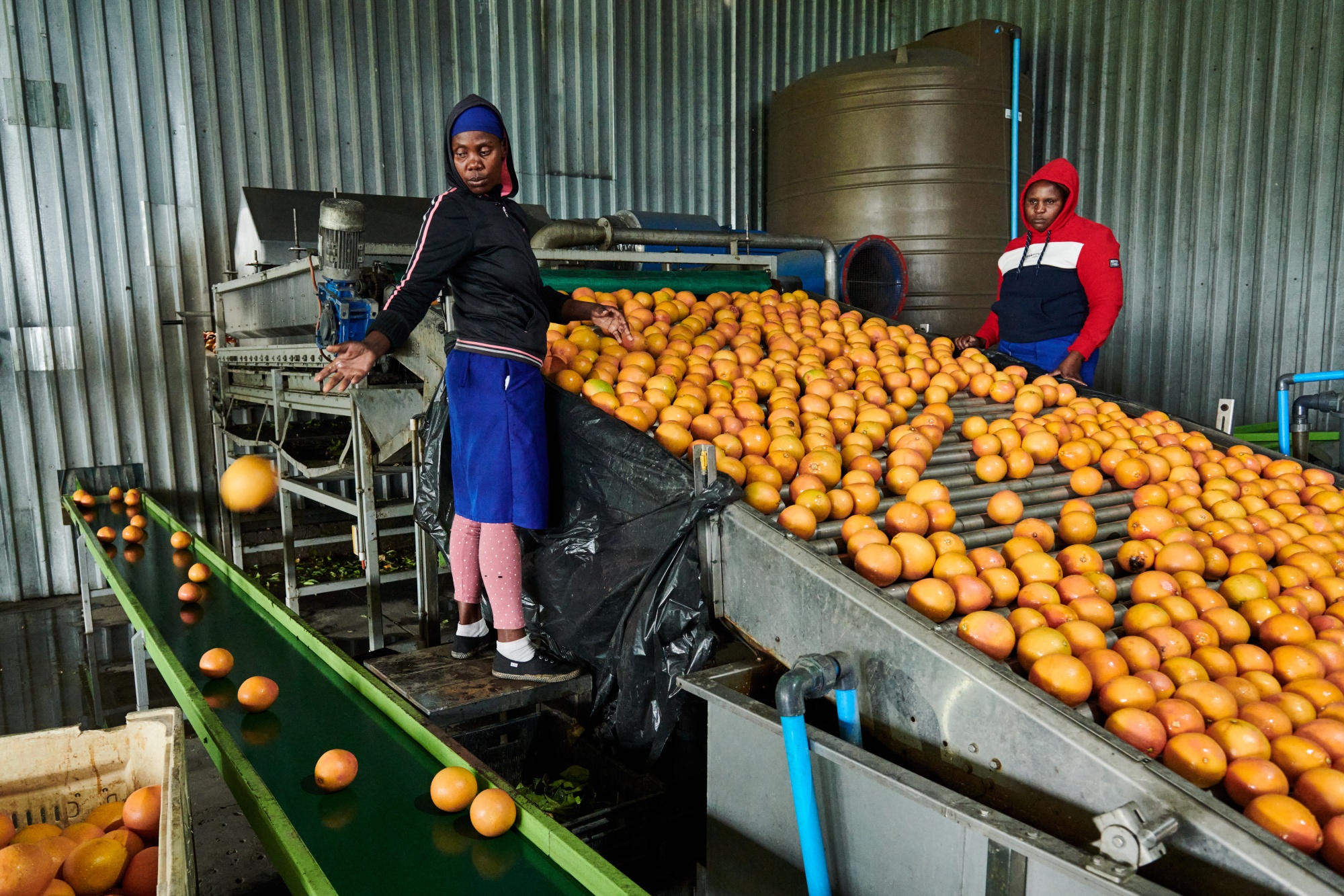 在南非与莫桑比克东部边界附近的布莱德瓦利农场的包装厂,工人们从传送带上摘下未成熟的葡萄柚。这是将它们运往数千英里外的出口市场以免腐烂的最佳机会。