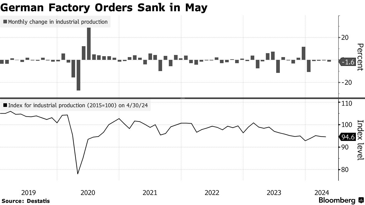 德国 工厂订单在五月意外下降 — 这是欧洲最大经济体复苏的最新挫折。