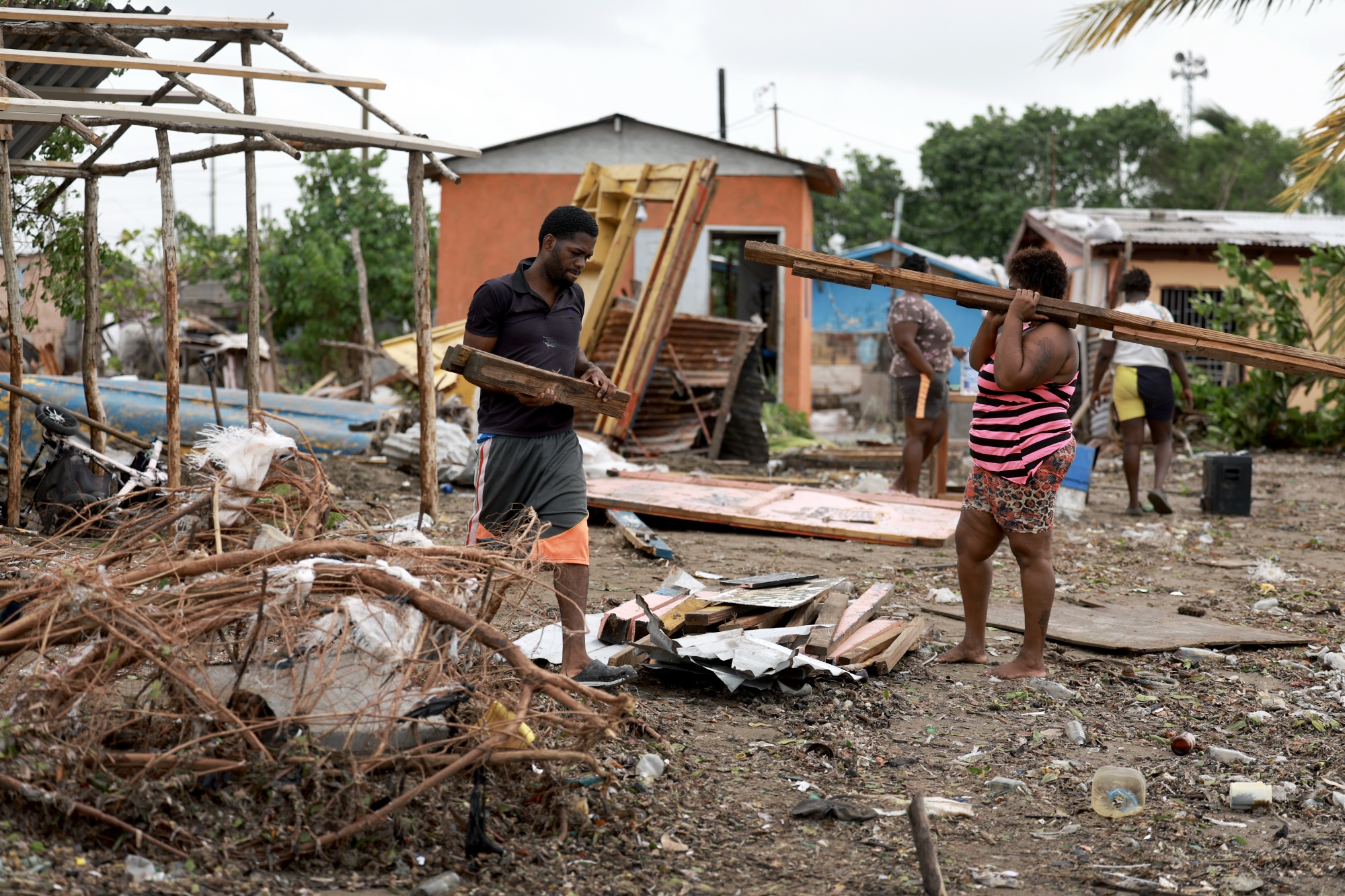 牙买加老港居民聚集在一起清理残骸,时间是7月4日。