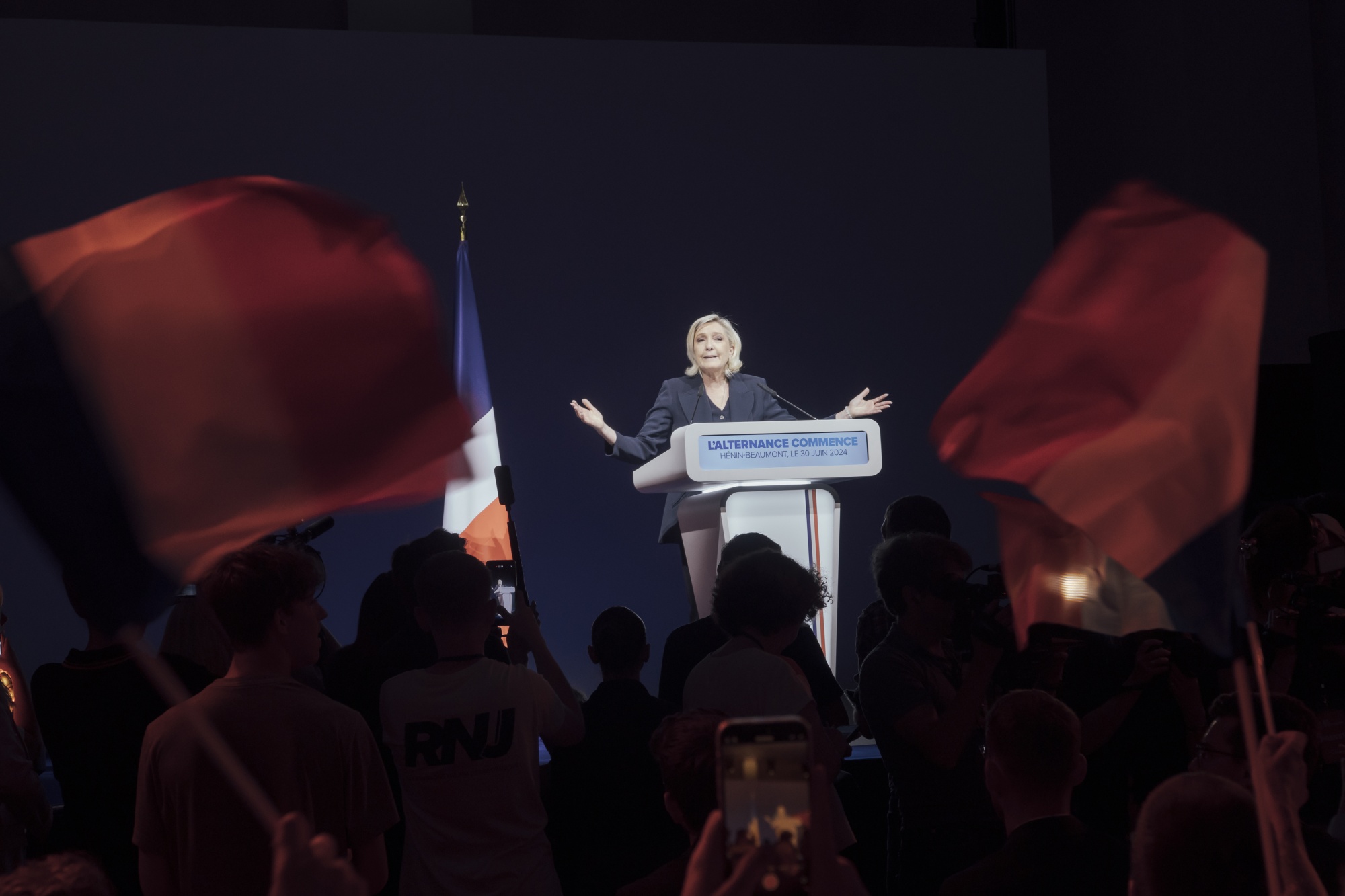 玛琳·勒庞,法国国民集会党领袖,在党部讲话,庆祝2024年6月30日星期日法国亨尼-博蒙选区立法选举第一轮投票结果。图片:Cyril Marcilhacy/Bloomberg根据两家调查公司的预测,玛琳·勒庞的国民集会党及其盟友在法国立法选举首轮投票中将远离绝对多数。