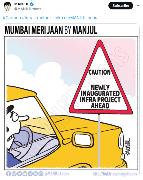 由Manjultoons制作。在X上。根据彭博经济学数据,未来两年将有价值44.4万亿卢比(5320亿美元)的新基础设施投入运营。这个数字等于过去11年建成的所有项目的价值。我们将密切关注。你所在城市或社区的新基础设施中最好(或最糟糕)的是什么?请发邮件至[email protected]分享。