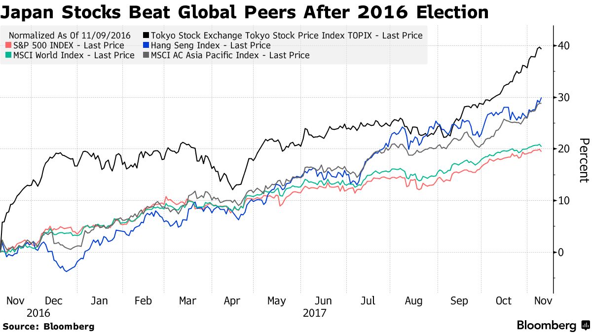 2016年特朗普赢得总统大选后的一年内,日本的Topix指数以美元计价上涨了近30%,超过了涨幅约为20%的标普500指数和MSCI世界指数。策略师表示,日元贬值将推动日本股市,正如基金在预期特朗普对北京采取更强硬立场的情况下寻找中国股票的替代品一样。