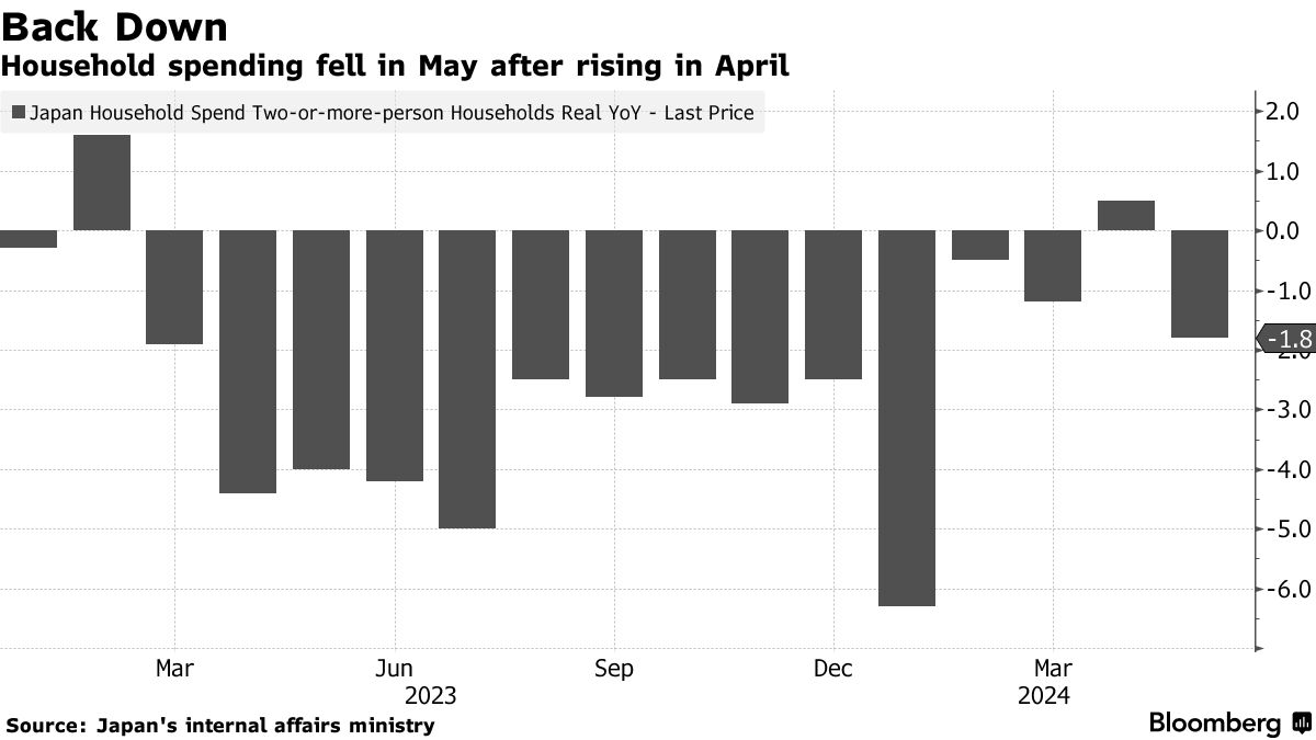 摄影师:Takaaki Iwabu/Bloomberg五月份日本家庭支出意外下降,增加了第二季度消费不会成为经济的主要推动力的可能性,并使央行下次加息的前景变得复杂。