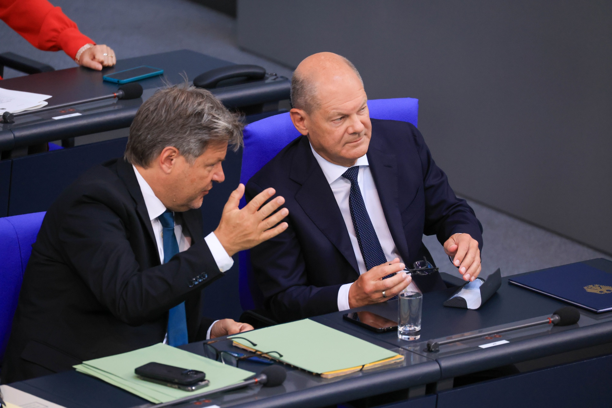 奥拉夫·肖尔茨,右,和罗伯特·哈贝克在柏林的联邦议院,日期为6月26日。摄影师:Krisztian Bocsi/Bloomberg德国执政联盟就明年预算和促进经济的新措施达成了延迟协议,结束了数周的争吵,这些争吵引发了对这个三党联盟治理能力的质疑。