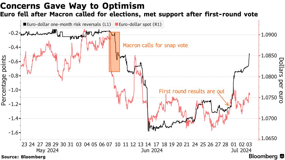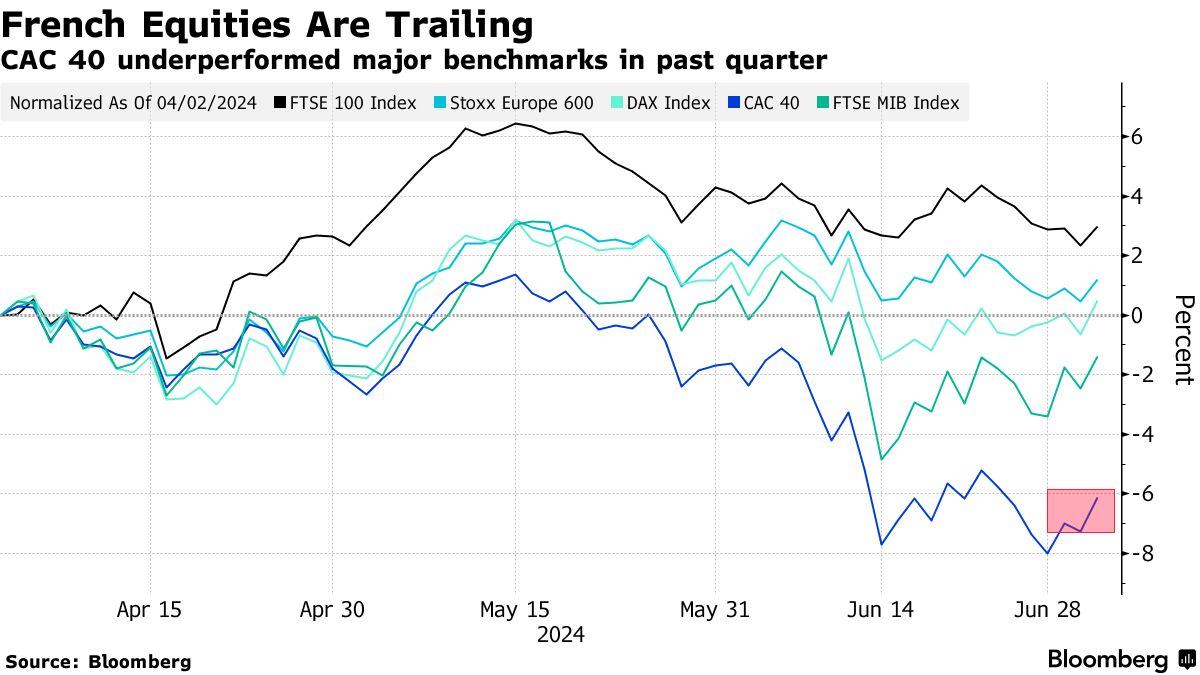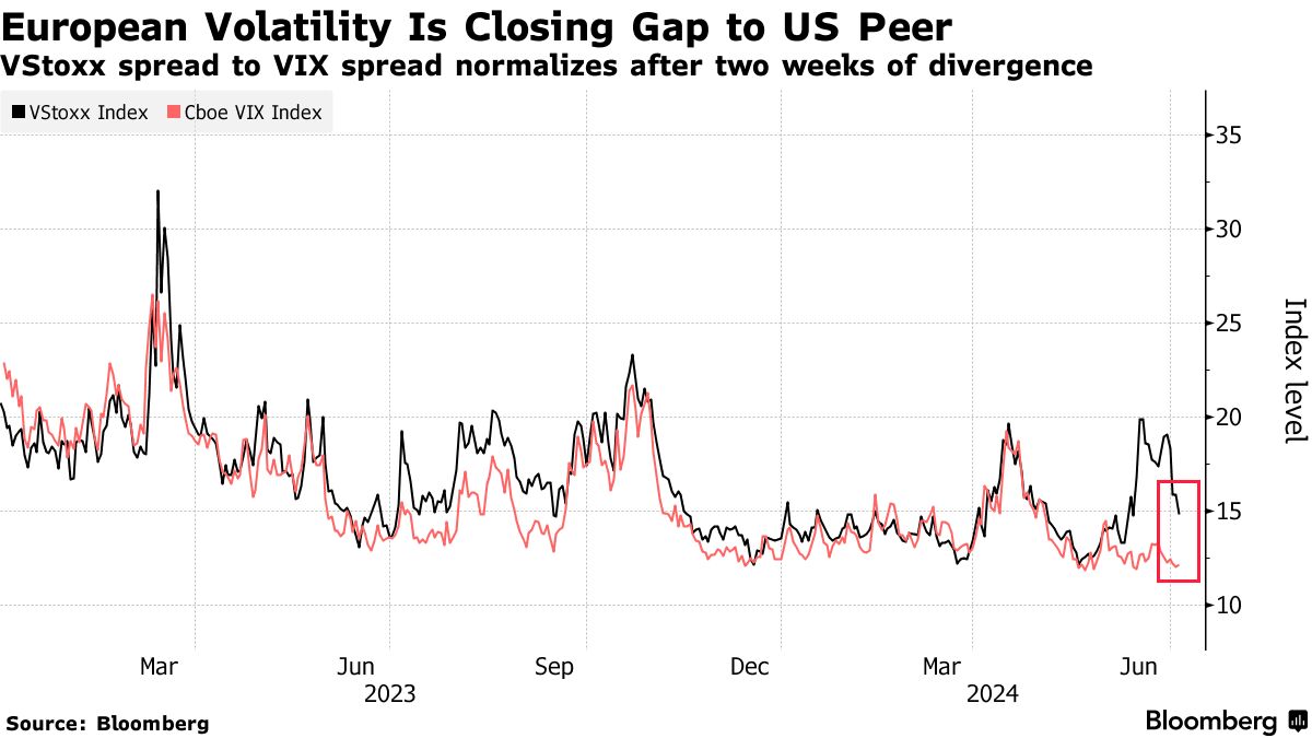 在第一轮投票缓解了对极右翼政府的担忧后,股市本周上涨,整体市场压力有所减轻。跟踪Euro Stoxx 50的波动率指数在6月份飙升至两年多来的最高水平后,缩小了与美国等值指数之间的差距。