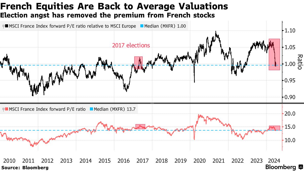 回撤还消除了投资者过去一年给予法国股票的估值溢价。CAC 40相对于德国DAX指数的估值现在接近去年年初美国地区银行危机前的最低水平。
