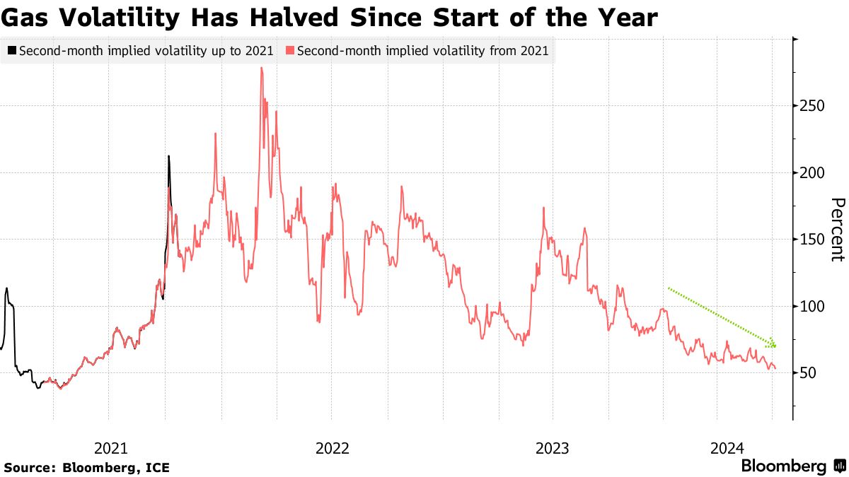 基准期货的隐含波动率——衡量衍生合约昂贵程度的指标——自年初以来几乎减半。这些合约现在处于自2021年4月以来的最低水平,那时该地区的俄罗斯天然气供应受到限制,引发价格飙升,导致欧洲能源危机。