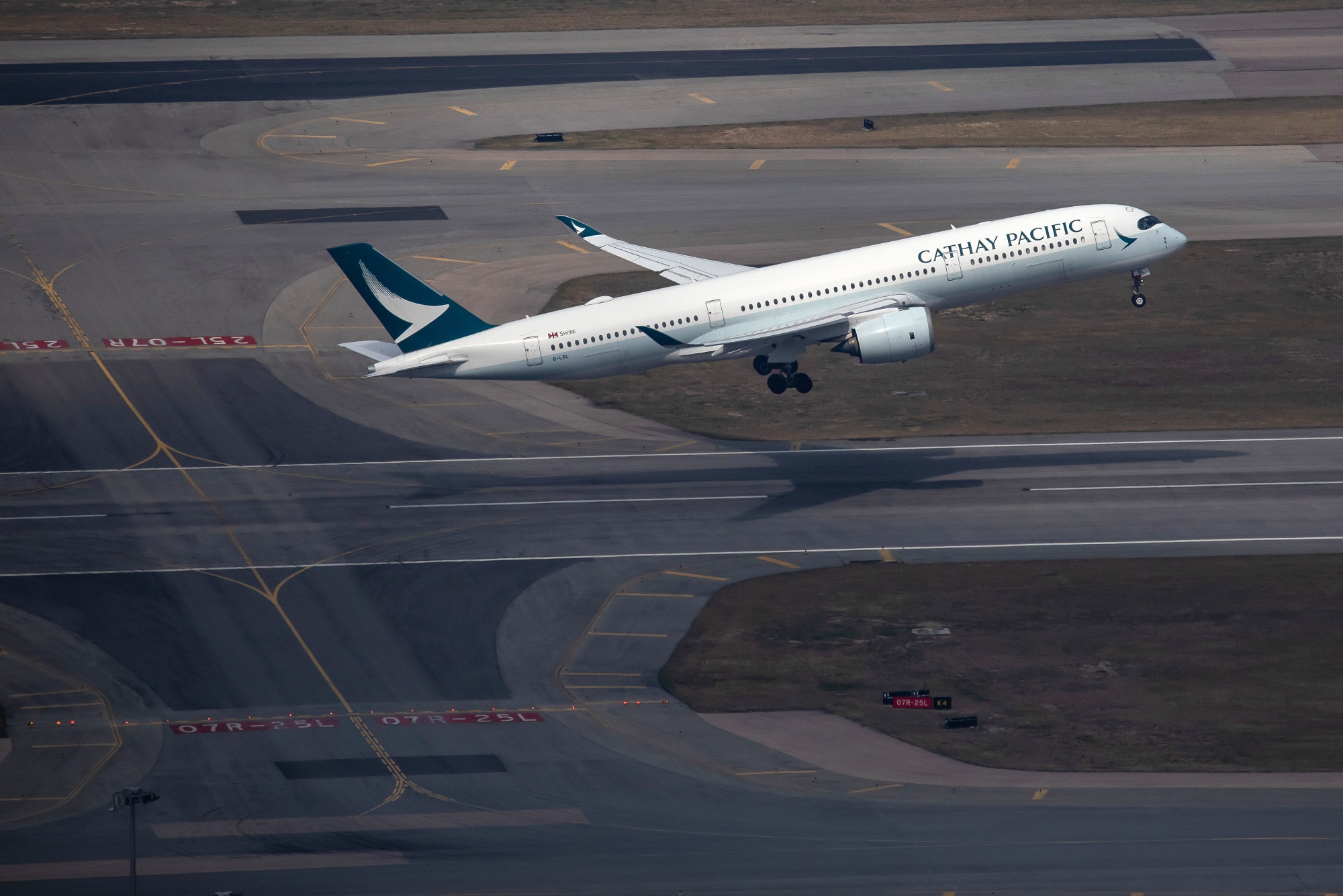 一架国泰航空公司的飞机从香港国际机场起飞。