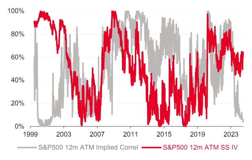 现在,当我说相关性最近下降时,我指的是实现和隐含的度量 — 意味着实际发生的情况以及期权市场中定价的情况。因此,现在是进入分散交易的昂贵时期。或者换句话说:你基本上是在赌注相关性会进一步下降。