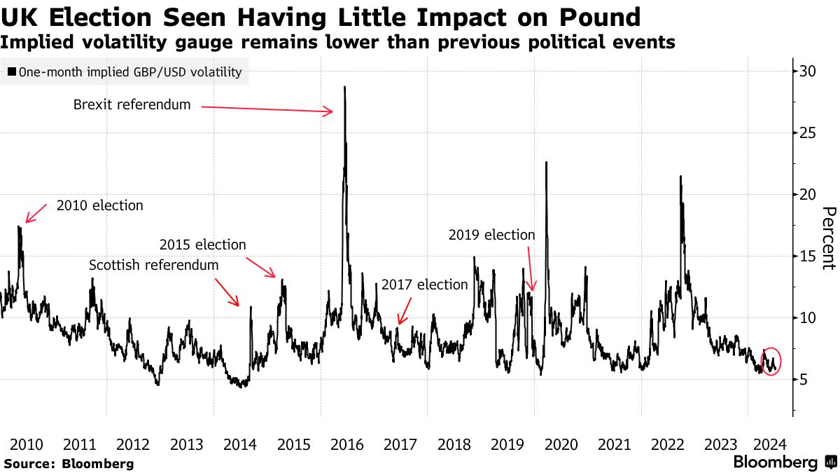 “我不会投票给工党,”我在城市里的一位长期合作伙伴(坚定的保守党支持者)本周告诉我,“但他们不会把事情搞砸。” 这种态度弥漫在英国的金融界,几个月来的情绪一直是保守党应该失去权力,而这并不重要。现在选民已经表态,采取了与城市相同的态度,通过战术性地反对保守党的选票,即使工党的选票份额并没有大幅增长。我们即将发现这种平静的氛围是否合理。在写作时,工党正在朝着自1906年以来最大的压倒性胜利前进,预计将在650个议席的下议院中获得200多个席位。但这种胜利令人感到奇怪。投票率非常低。奈杰尔·法拉奇(Nigel Farage)的改革英国(Reform UK)党似乎已经获得了重要的立足点,可能获得了十几个席位,这表明英国对大陆上正在兴起的民粹主义持有好感。这对保守党来说是一次巨大的谴责。甚至财政大臣杰里米·亨特(Jeremy Hunt)似乎也失去了席位。但这并没有引起民众的兴奋,或者最初没有引起货币市场的激动,英镑几乎没有变动。